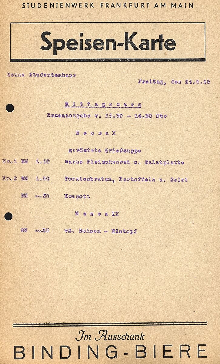 100 Jahre Studierendenwerk Frankfurt am Main heißt auch 100 Jahre Verpflegung der Studierenden mit Speisen und Getränken. Ein willkommener Anlass, um Sie auf eine Zeitreise durch die Entwicklung unserer heute mehr als 30 Verpflegungsbetriebe mitzunehmen. Lesen Sie weiter und erfahren Sie alles über die Gründung unseres ersten Verpflegungsbetriebs und über den stetigen Wandel des Essverhaltens der Studierenden, geprägt durch das jeweilige Zeitgeschehen und den technischen Fortschritt.